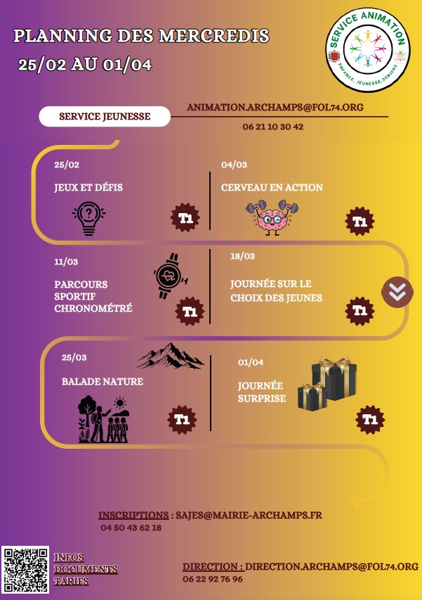 Pour toutes informations sur les différents programmes du service jeunesse, merci de contacter l’animateur jeunesse à l’adresse suivante : animation.archamps@fol74.org ou au 06.21.10.30.42