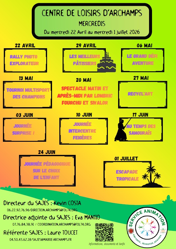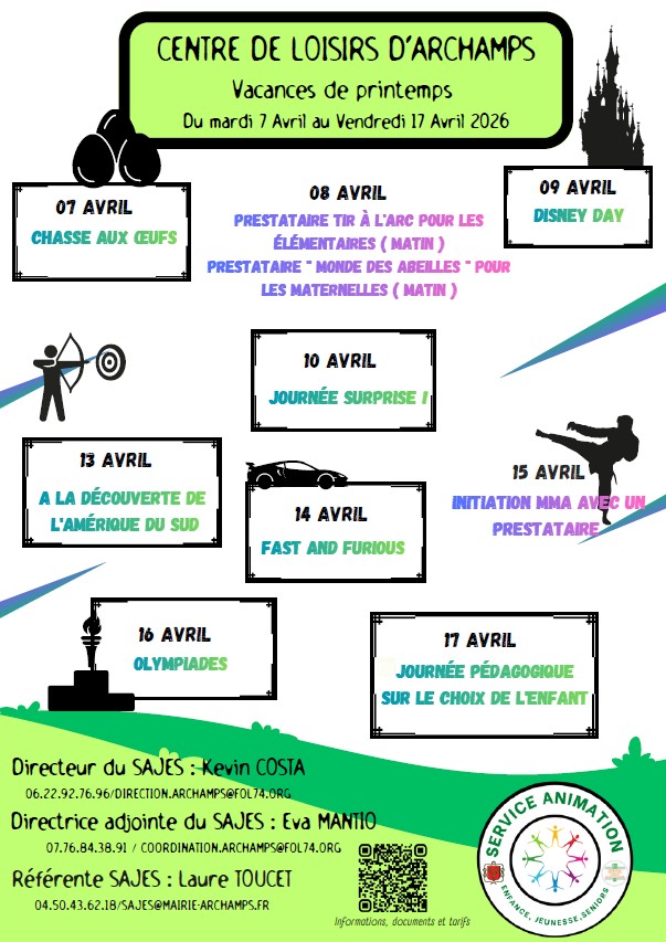 Pour la partie éducative et organisationnelle, merci de vous adresser au directeur : direction.archamps@fol74.org / 06 22 92 76 96 ou la directrice adjointe : coordination.archamps@fol74.org / 07 76 84 38 91