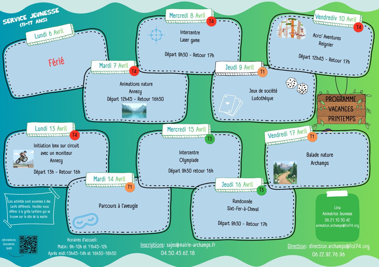 Pour toutes informations sur les différents programmes du service jeunesse, merci de contacter l’animateur jeunesse à l’adresse suivante : animation.archamps@fol74.org ou au 06.21.10.30.42